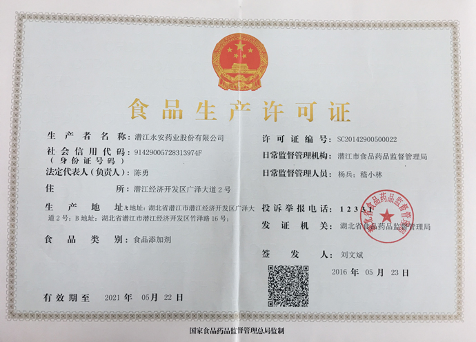 潛江永安藥業股份有限公司成立于2001年,坐落于江漢平原腹地潛江市國家高新技術產業開發區,占地500余畝,注冊資金貳億玖仟肆佰陸拾捌萬貳仟伍佰元整,是一家擁有自主知識產權的國家高新技術企業。公司股票于2010年3 月5日在深圳證券交易所掛牌上市(股票代碼為002365)。公司具有雄厚的技術開發能力,是湖北省創新型企業和湖北省知識產權建設示范企業。公司研發平臺分別被認定為省級企業技術中心和湖北省功能性食品添加劑工程技術研究中心。 經過多年的發展,公司形成了以食品及藥品添加劑?;?/p>